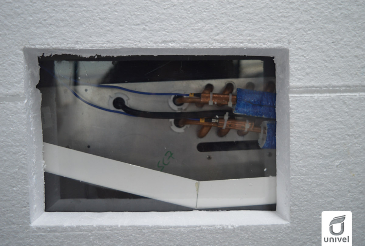 Élvio explica que a bancada apresenta os cinco componentes básicos necessários para que o processo de refrigeração por expansão aconteça: evaporador, compressor, condensador, filtro secador e sistema de expansão. O acadêmico esclarece que além de poder visualizar estes componentes em funcionamento em uma bancada ergonômico, o uso de manômetros, termopares e rotâmetro permitirá a coleta das pressões, temperaturas e vazão do ciclo, informações que poderão ser utilizadas para comparar com dados da teoria.