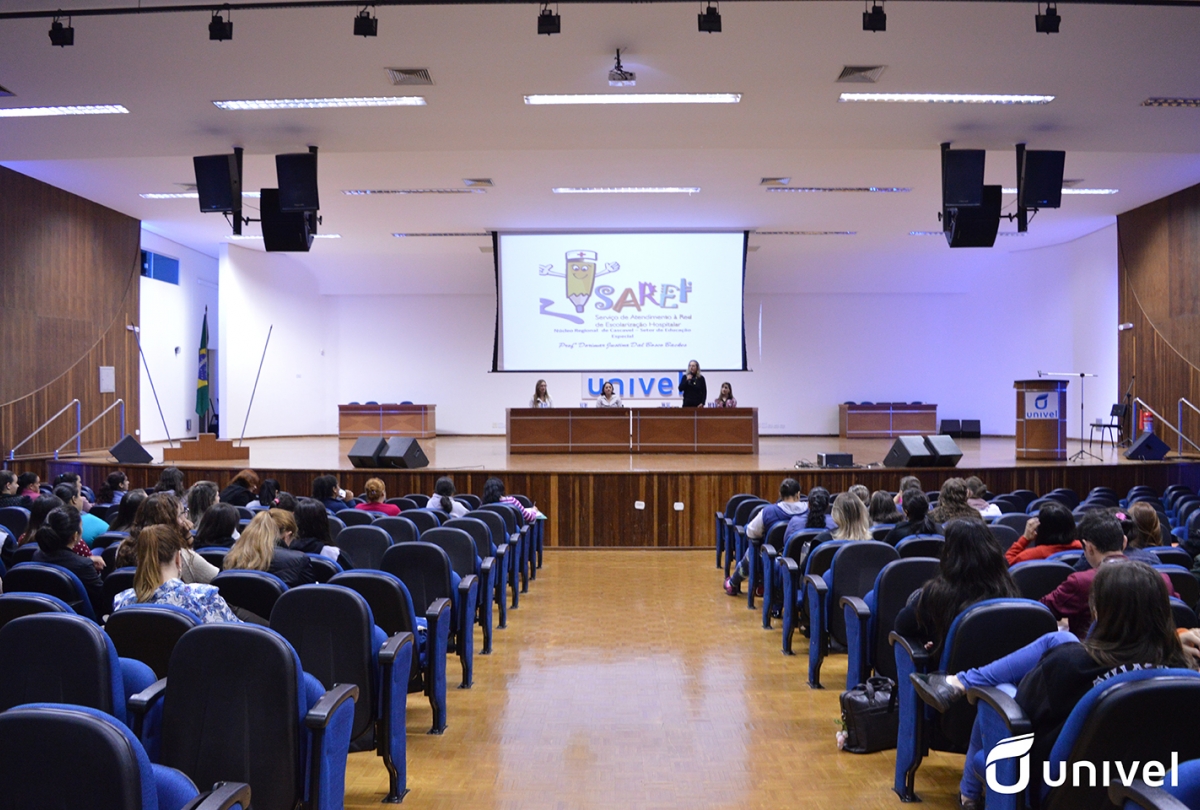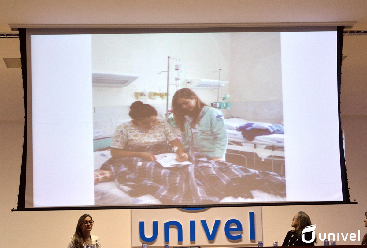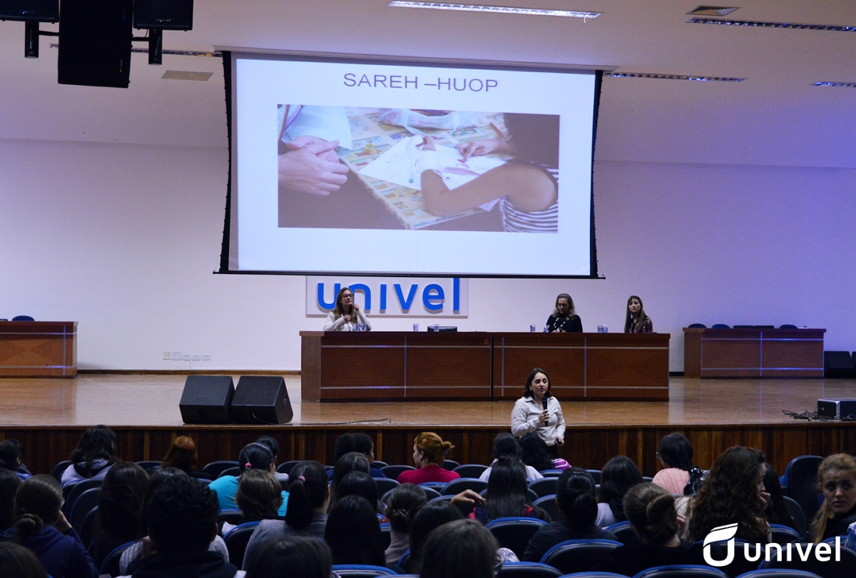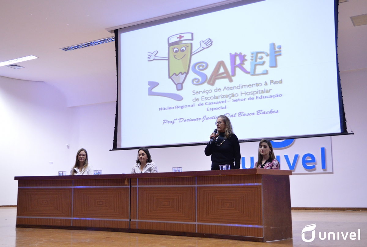 As palestrantes Dorimar Backer, Aryadny Neubauer, Sandra Mara Maciel Vieira e Evelin Ferreira do SAREH Cascavel, falaram sobre as leis que respaldam o projeto e como é feito este trabalho junto dos alunos. Elas contaram algumas experiências vividas através deste trabalho e como ele é importante para os alunos. Isto porque, quando a criança está hospitalizada, a percepção dela fica diferente e para muitos, é um momento de descontração.