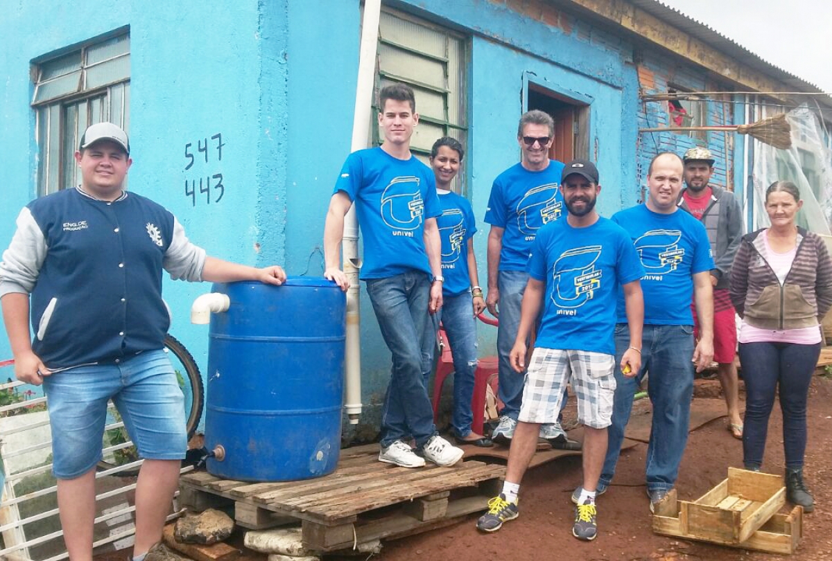 Acadêmicos do curso de Engenharia de Produção finalizaram no último sábado (3), a 1ª edição do projeto "Engenheiros Solidários". Desde o mês de julho os alunos trabalharam na construção de cisternas feitas de galões para armazenamento de água da chuva e calhas com sistema de captação, amortecimento da água, filtro e escoamento por torneiras para uso de irrigação de hortas e limpeza em geral.