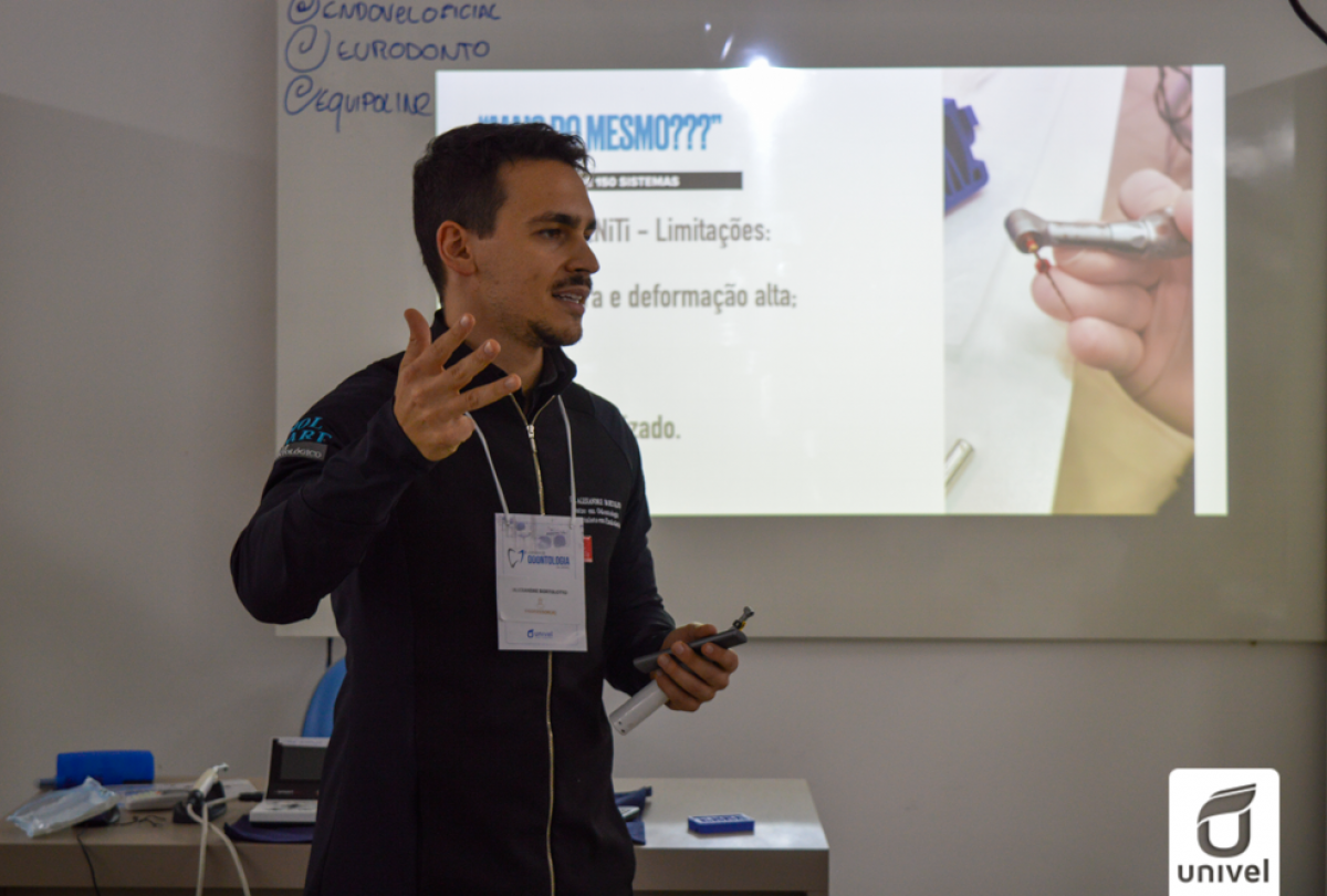 Para compartilhar conhecimento acerca das “Aplicações da Tecnologia na Odontologia Restauradora”, foi convidado o professor Dr. Guilherme Schmitt de Andrade, que é Mestre e Doutor em Prótese Dentária pela Unesp, revisor ad-hoc de revistas científicas nacionais e internacionais, possui mais de 30 artigos e capítulos de livros também nacionais e internacionais. Durante o evento, o professor Alexandre Luis Bortoloto, realizou uma atividade prática na Pré Clínica, com o tema “Sistema Reciprocante com W-File - TDK”.