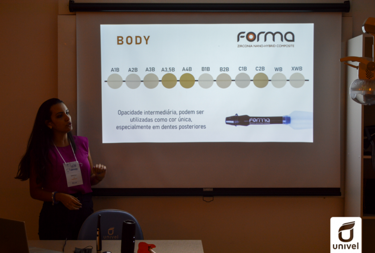 Para concluir o evento com chave de ouro, também foi realizada uma atividade prática na Pré Clínica, sobre “Facetas de resina composta em dentes anteriores de forma simples e versátil”, com a professora Dra. Marina Gullo Augusto, que é mestre e doutora em dentística pela UNESP, possui mais de 20 artigos científicos publicados em periódicos nacionais e internacionais, é pesquisadora visitante na Universidade da Alemanha e também atua como docente na Unioeste e Univel.